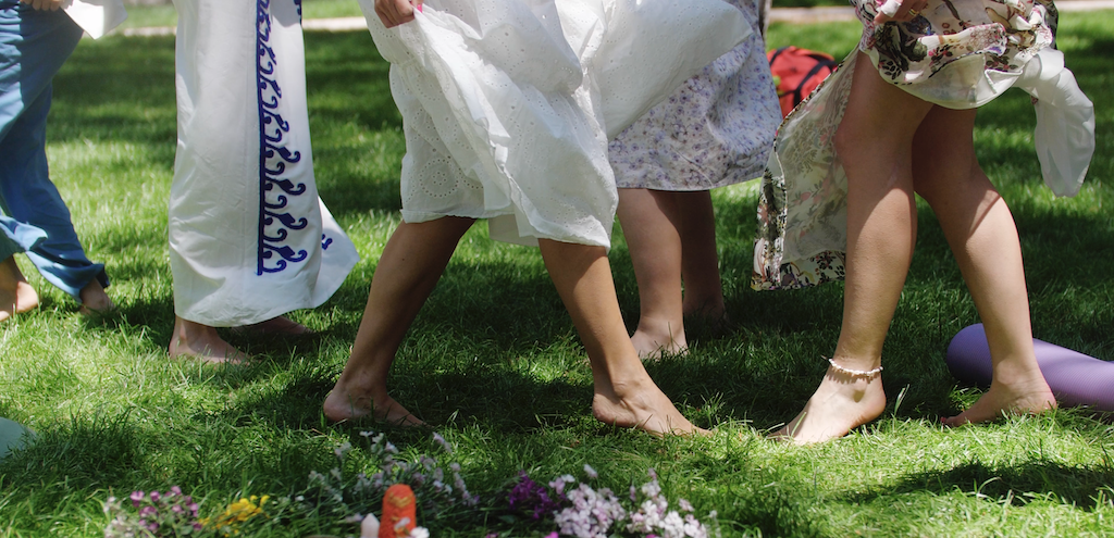 Vouden is een dansreis, buiten, met blote voeten in het gras.
